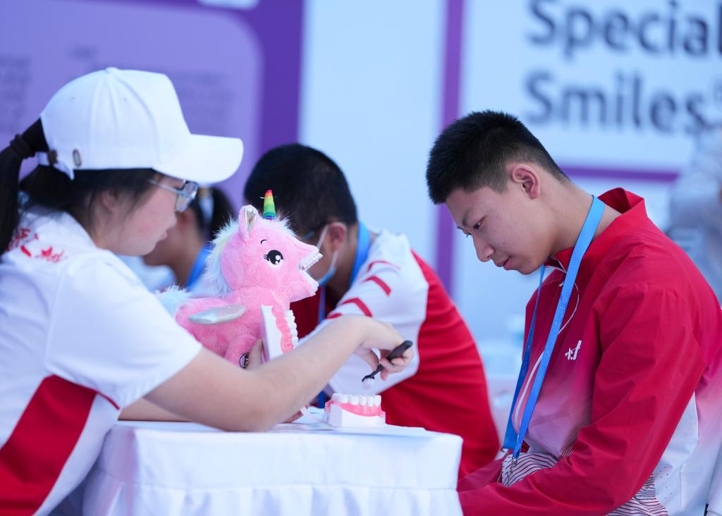 12月8日,在广东省中山市体育馆副馆,工作人员为特奥运动员普及护齿知识。新华社记者 杨晨光 摄